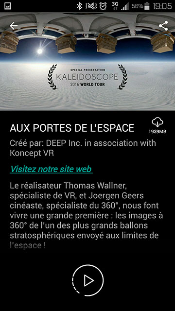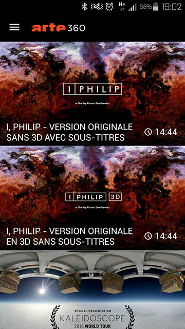 ARTE 360 est une application de réalité virtuelle pour Cardboard et casque VR mobiles sous Android et IOS. Il s’agit d’un portail de vidéos 360 de grande qualité artistique et visuelle. L’application ARTE 360 propose encore peu de contenu, mais l’application n’en est qu’à ses débuts.