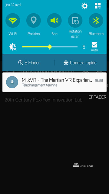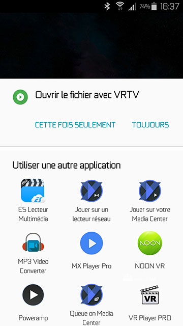 La notification indiquant la fin du téléchargement est « cliquable » et permet dès lors d’utiliser son lecteur VR préféré, VRTV ou VRPlayer pour ne citer qu’eux. Il ne reste plus qu’à trouver les bons paramètres de projections. Vous pouvez aussi vous rendre dans ce répertoire à l’aide d’un explorateur de fichier Android comme ES Explorer et copier ces vidéo ou bon vous semble.