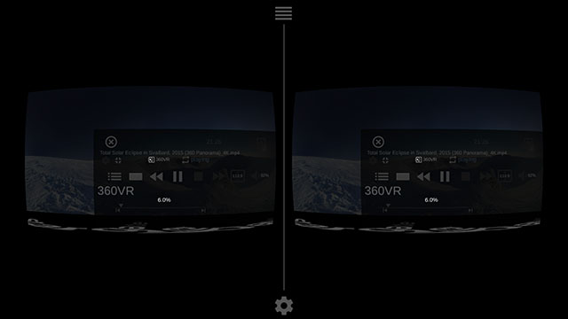 L’interface 3D vous permet d’accéder à tous les réglages en mode VR, c’est à dire en conservant le smartphone dans le casque et en n’utilisant que le « head tracking » pour modifier les options. Vous trouverez tous les réglages disponibles dans l’interface 2D avec en prime les commandes de lecture et les différents modes d’affichage (side by side, top bottom, 2D) ainsi qu’un explorateur de fichier.
