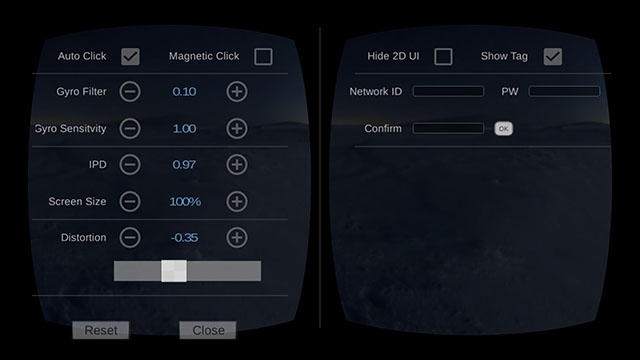 Ce logiciel dispose maintenant de deux interfaces graphiques, la première est une interface 2D permettant un accès aux réglages en dehors du casque VR.