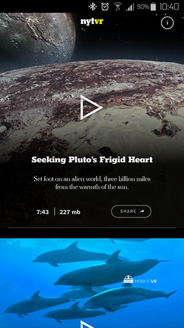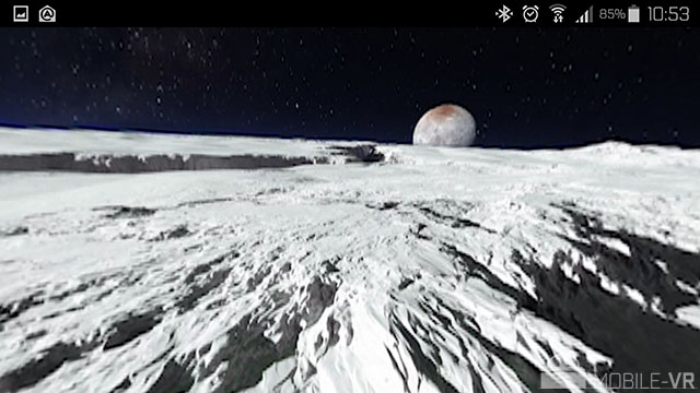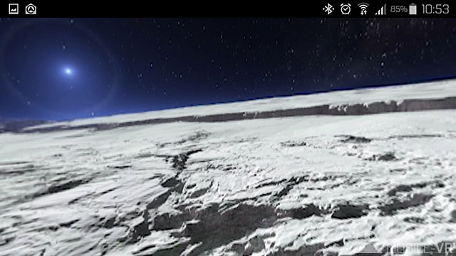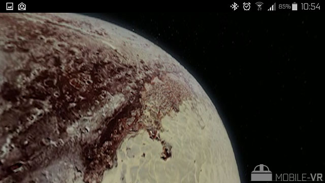 L’application comporte une dizaine de vidéos 360°, celles-ci ne sont en revanche pas proposées en stéréoscopie et la résolution n’est pas exceptionnelle. Dommage, car le contenu est extrêmement intéressant et instructif. Dernière vidéo en date, une superbe vue de Pluton mêlant subtilement prise de vues réelles, modélisations et images de synthèses. La vidéo est à couper le souffle, une des plus belles vidéos 360° disponibles à ce jour.