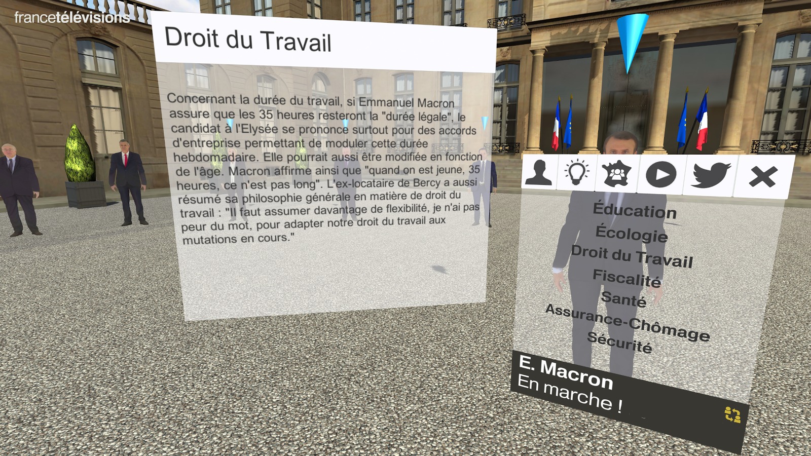 France Télévisions a reçu l’aval des 11 candidats qui ont accepté d’être numérisés pour figurer dans cette application. Présidentielle VR propose de découvrir les programmes des différents candidats de manière ludique avec un classement par thèmes.