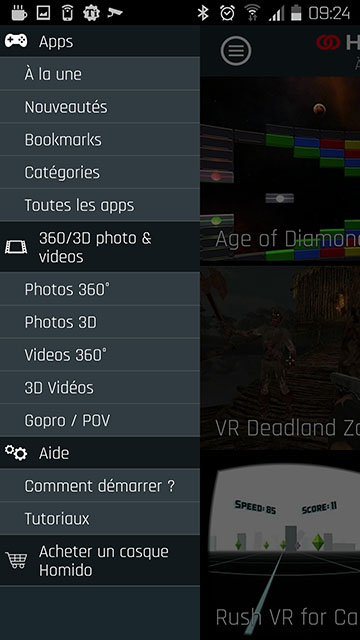 Véritable portail d’applications VR, l’ Homido center permet ce que le Google Play ne fait pas, à savoir : lister et rassembler les meilleures applications VR. Vous y trouverez aussi des liens vers des vidéos et photos 360 ainsi qu’un accès direct aux différents tutoriels présents sur le site homido.com.