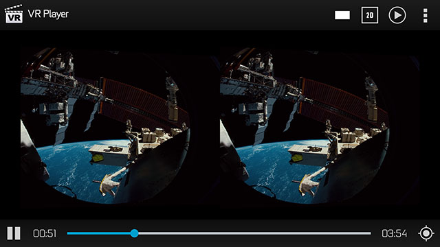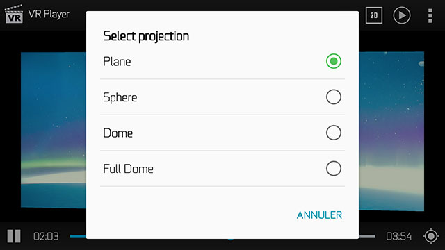 Il s’agit tout simplement du meilleur lecteur vidéo VR pour Android. VR Player est capable de lire des vidéos classiques, à 180°, 360° en 2D ou 3D (SBS et TBP). Il gère le stockage sur carte mémoire ou réseau via une application tierce type ES Explorer.