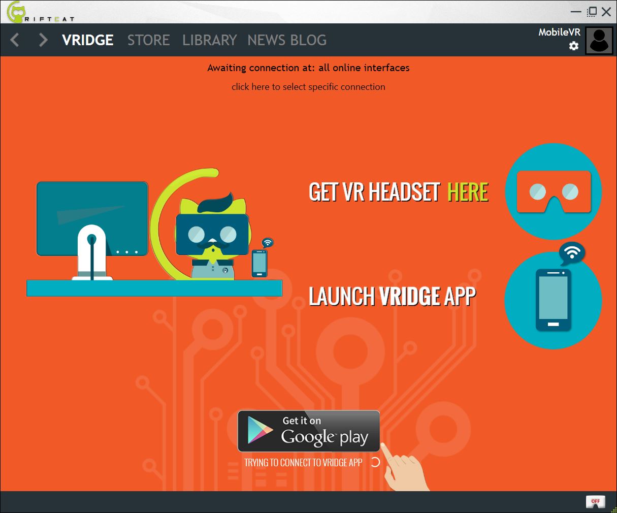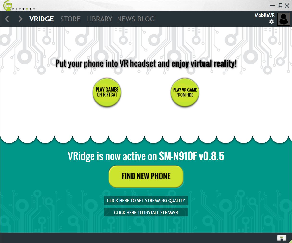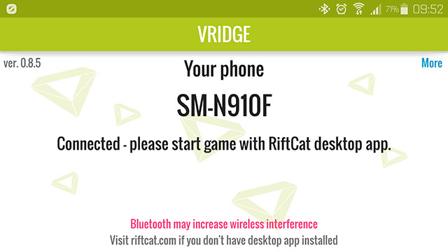 - Exécutez en premier lieu RiftCat serveur puis VRidge sur le smartphone. Une fois la connexion établie entre le serveur et l’application rendez-vous dans l’onglet VRIdge de RiftCat serveur puis installez le driver SteamVR en cliquant sur « Click Here to Install SteamVR »