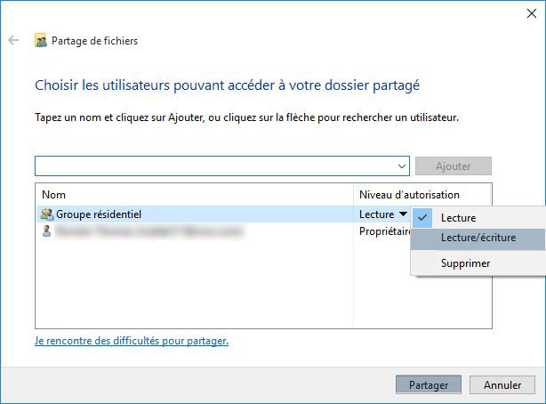 4- Dans la colonne « Niveau d’autorisation », choisissez « Lecture/écriture » si vous souhaitez éditer les fichiers à partir de votre smartphone ou « Lecture » pour une lecture seule. Notez l’adresse de votre dossier à l’emplacement encadré en bleu sur l’illustration et enfin cliquez sur « Partager ».