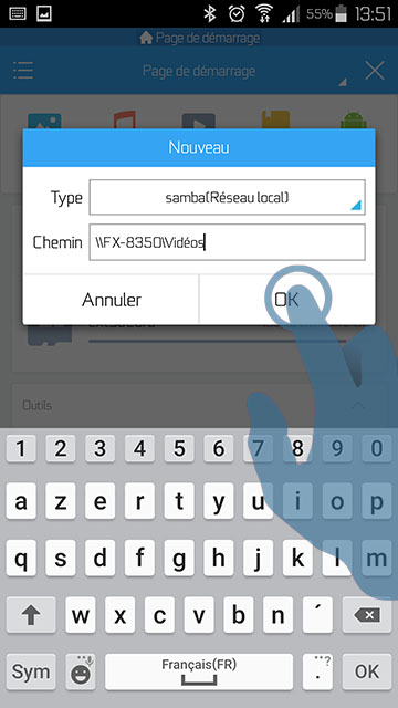 5- Sur votre smartphone assurez-vous d’être connecté en WiFi sur le même réseau que votre ordinateur hébergeant le dossier partagé puis ouvrez ES explorer. Appuyez ensuite sur l’icône +. Dans Type, sélectionnez « samba » puis dans « Chemin » saisissez l’adresse de votre dossier.