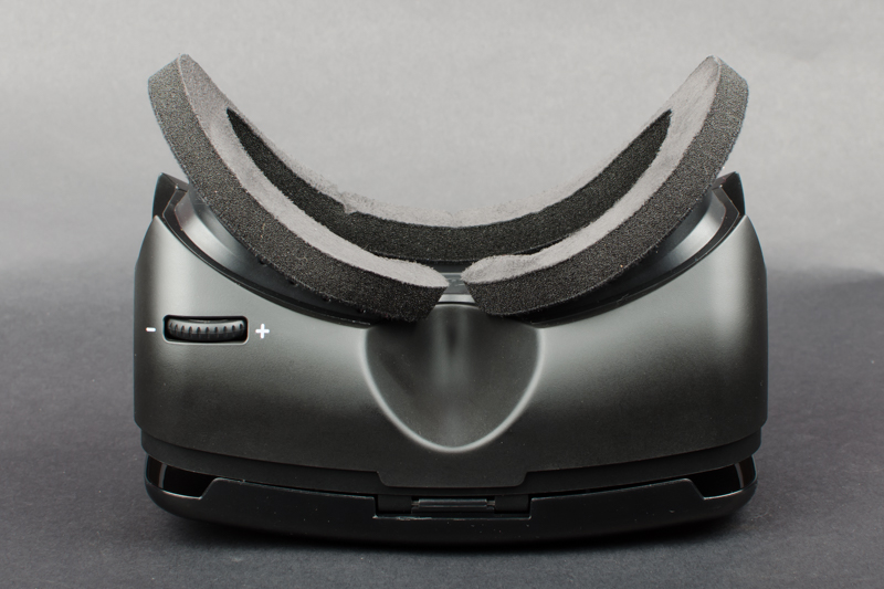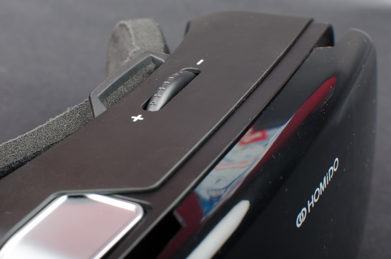 Une molette est bien en place sur le dessus, mais celle si inaugure le nouveau système de réglage de dioptrie mis en place par Homido. Cette molette permet donc d’adapter la vision aussi bien aux myopes qu’aux hypermétropes. La course de celle-ci est volontairement longue afin que ce réglage primordial soit le plus fin possible.