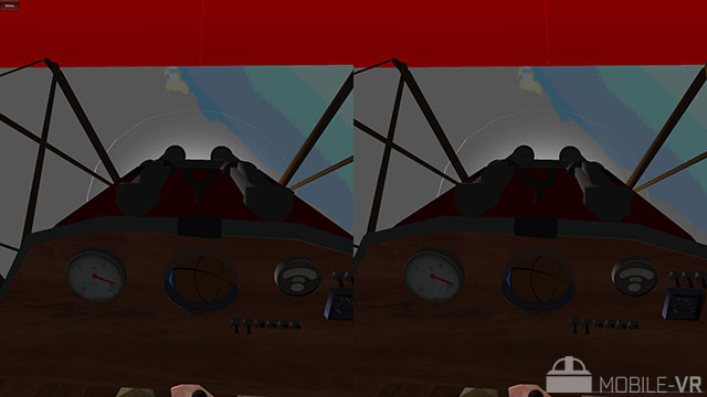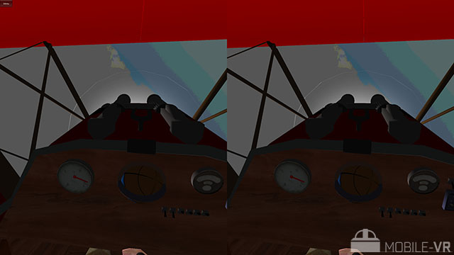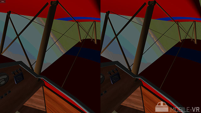 Cette application ne brille pas par ses textures et ses environnements, en revanche l’avion est correctement modélisé, ce qui impressionne est le très bon framerate et les réactions de l’avion qui obéit au doigt et à l’œil. L’application repose sur le SDK Dive qui permet un très bon framerate mais ne supporte malheureusement pas les réglages par QR Codes. Les décors sont laids, c’est un fait mais malgré tout les sensations sont bien réelles grâce à un head tracking réussi et une faible latence dans le report des mouvements au sein du jeu.