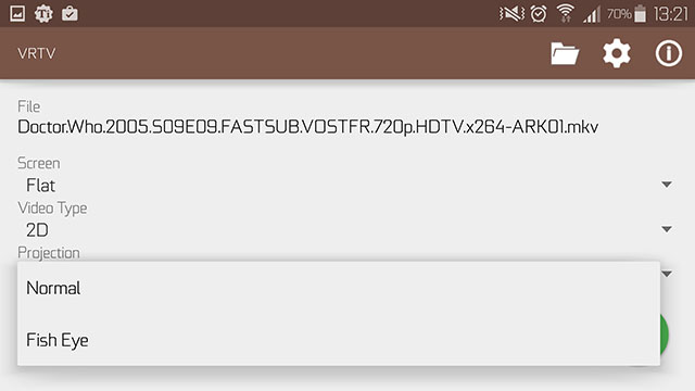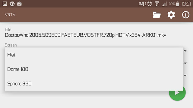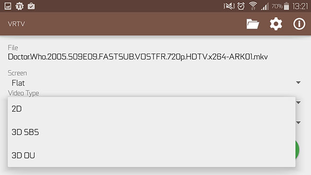 À l’ouverture de VRTV il vous suffira de choisir votre fichier à l’aide de l’explorateur intégré à l’application puis de choisir le type de vidéo (plane, 180 ou 360) et enfin si celle-ci est en 2D, 3D SBS ou 3D TB.